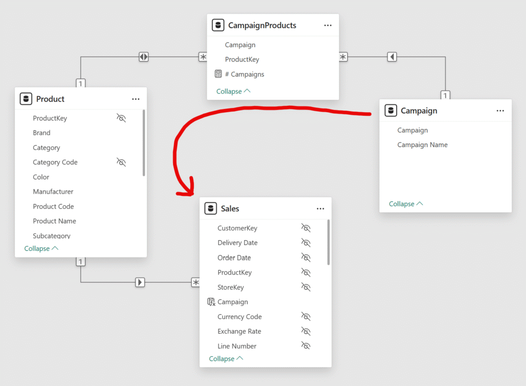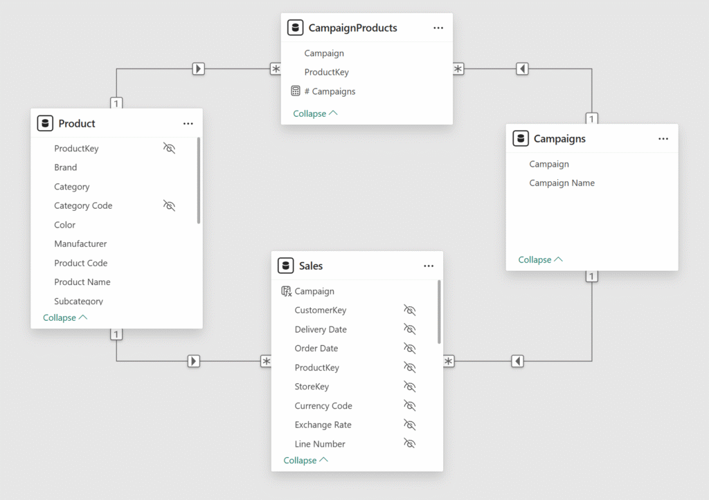 این طراحی به این معناست که فیلتر کردن یک کمپین، بهطور خودکار محصولات مرتبط را از طریق Bridge Table فیلتر نمیکند. Measureهایی که در ادامه ساخته میشوند، در مواقع لازم با استفاده از تابع CROSSFILTER، فیلتر دوطرفه (Bidirectional Filtering) را بهصورت پویا فعال میکنند. این کار به ما اجازه میدهد تمام محصولاتی را که در یک کمپین مشارکت داشتهاند، صرفنظر از Attribution تراکنشها در جدول Sales، در تحلیل لحاظ کنیم.