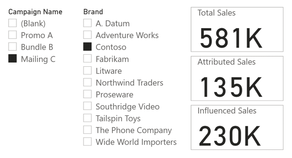 جدول Campaign میتواند Measureهایی را که تا اینجا معرفی کردیم فیلتر کند. با این حال، زمانی که یک کمپین خاص را فیلتر میکنید، مقدار Unattributed Sales همیشه Blank خواهد بود؛ همانطور که در تصویر بعدی مشاهده میشود.