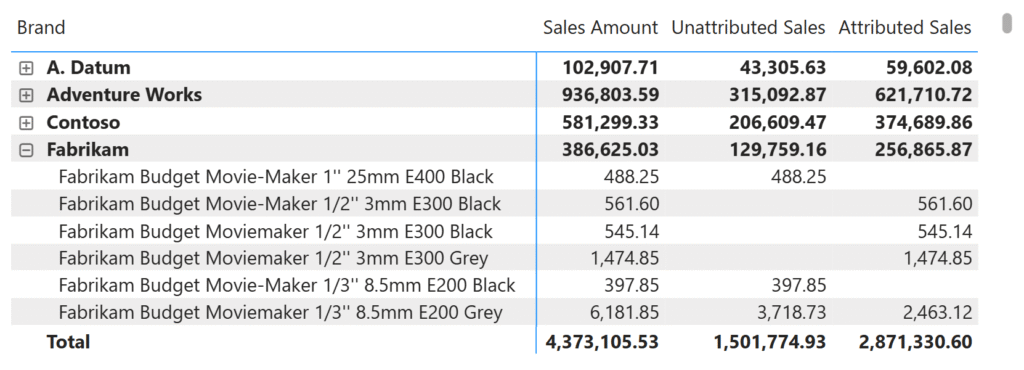 Measureهای Attributed Sales و Unattributed Sales مکمل یکدیگر هستند. برای هر محصول مشخص، جمع این دو Measure دقیقاً برابر با Sales Amount کل خواهد بود؛ همانطور که در تصویر بعدی نشان داده شده است.
