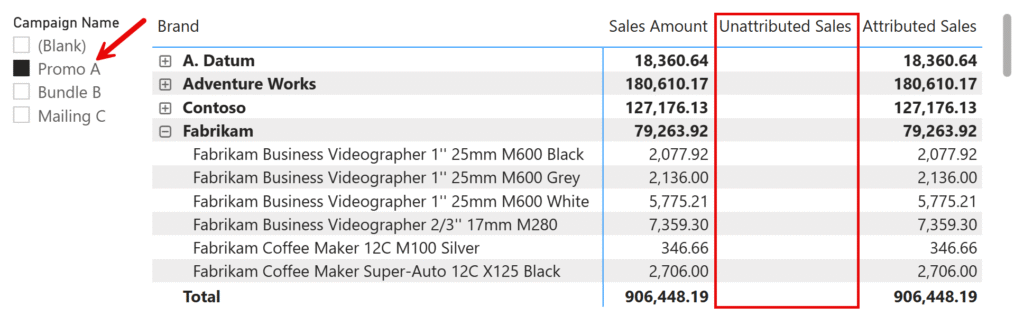 مثلاً وقتی گزارش را فقط در سطح Brand مشاهده میکنید، Measure از REMOVEFILTERS استفاده میکند تا هرگونه فیلتر انتخابشده روی کمپینها نادیده گرفته شود و سپس فقط ردیف Blank کمپین فیلتر شود. این کار تضمین میکند که مقدار Unattributed Sales در سطح برند نمایش داده شود، حتی اگر کاربر در Slicer یک یا چند کمپین خاص را انتخاب کرده باشد.