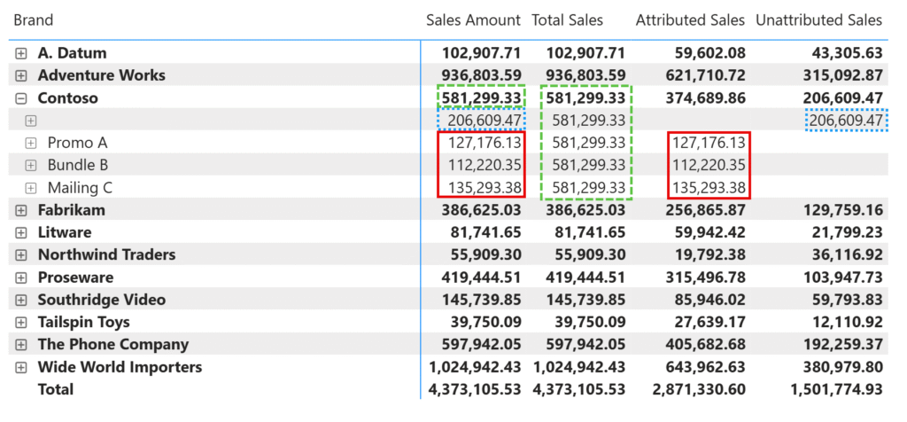 گزارش زیر تفاوت بین Total Sales و Sales Amount را بهخوبی نشان میدهد. در این گزارش، یک Matrix وجود دارد که در آن ستون Product[Brand] در سطرها قرار دارد و Campaign[Campaign Name] بهصورت یک Hierarchy تودرتو نمایش داده میشود.