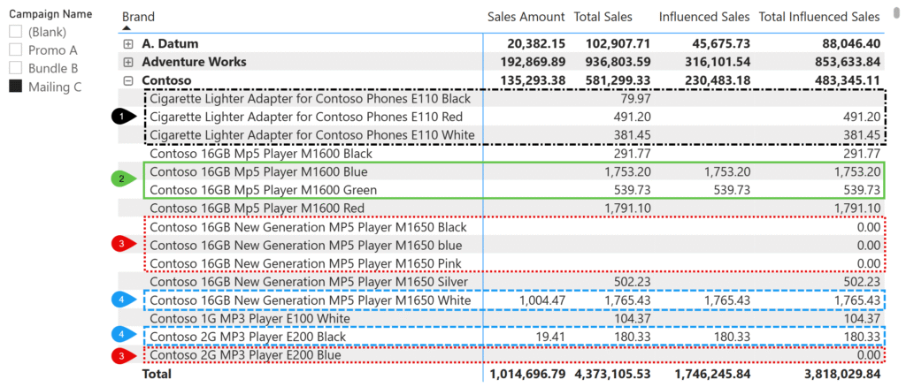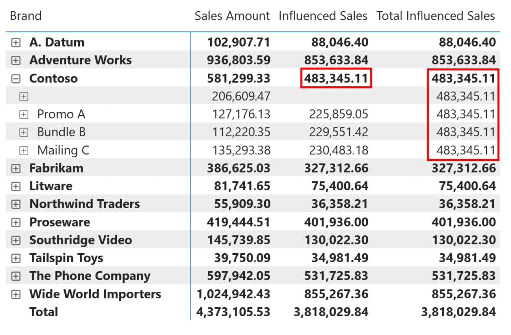 وقتی برند Contoso را باز میکنیم تا کمپینهای جداگانه را ببینیم، رفتار Measureها متفاوت میشود.
