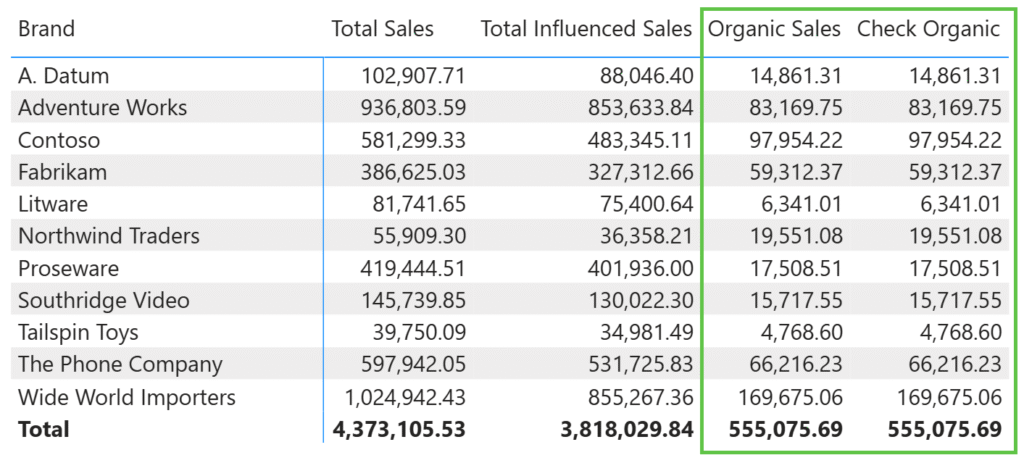 Check Organic = [Total Sales] - [Total Influenced Sales]